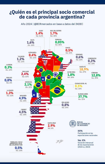 Según un reciente informe de la Bolsa de Comercio de Rosario (BCR) titulado Las exportaciones a lo largo y a lo ancho del país: un 2024 de recuperación, el comercio exterior argentino experimentó un crecimiento generalizado en 2024, revirtiendo la contracción sufrida en el año anterior como consecuencia de una de las peores sequías en décadas. El documento subraya que todas las provincias incrementaron sus exportaciones, destacándose el papel central de Santa Fe, que concentró el 19% del total nacional y registró un incremento del 27% en sus envíos, lo que representó un aporte adicional de 3.118 millones de dólares.