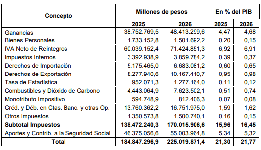En lo que respecta a los ingresos impositivos, el Gobierno proyecta un crecimiento del 22,5% respecto de 2025. Dentro de estos, los Derechos de Exportación, o retenciones, se espera que aumenten un 22,8%, aportando unos 10.000 millones de pesos, lo que representa 2.000 millones más que en 2025.