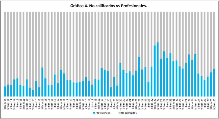 En cuanto a la calificación de los puestos, la tendencia se mantiene: los puestos no calificados superan a los profesionales en una relación de 67% contra 33%, respectivamente. La participación predominante por función fue del rubro técnico, con un 69%, seguido por administrativos y ventas con un 23%, y puestos gerenciales con un 8%.