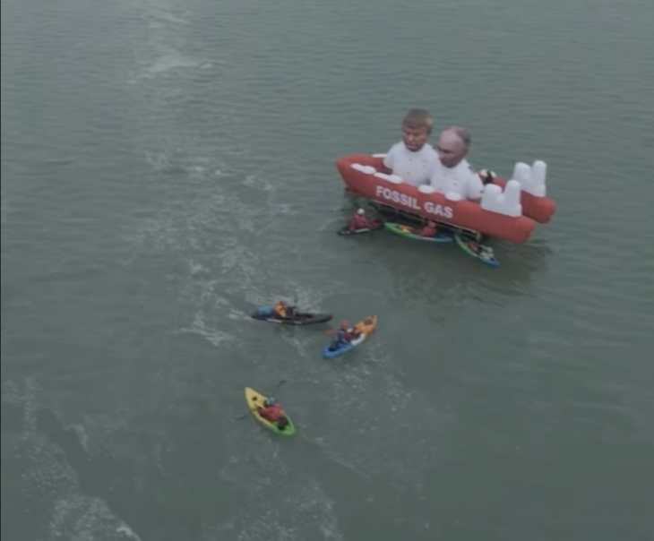 El contexto de la protesta se enmarca en la intención de la UE de prohibir las importaciones de GNL ruso un año antes de lo previsto, como parte de un nuevo paquete de sanciones contra Moscú, tras la presión ejercida por el presidente estadounidense Donald Trump.