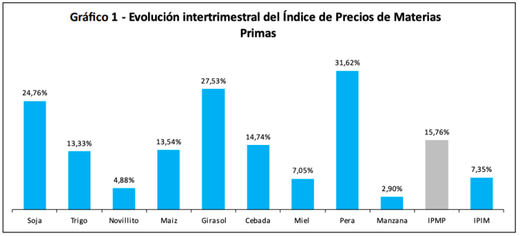 ¿Cómo se compara este comportamiento con el nivel general de precios? Mientras el índice de precios de materias primas agroindustriales subió un 15,76% intertrimestral y 40,02% interanual, el Índice de Precios Internos al por Mayor (IPIM) mostró variaciones significativamente menores: 7,35% intertrimestral y 22,42% interanual.