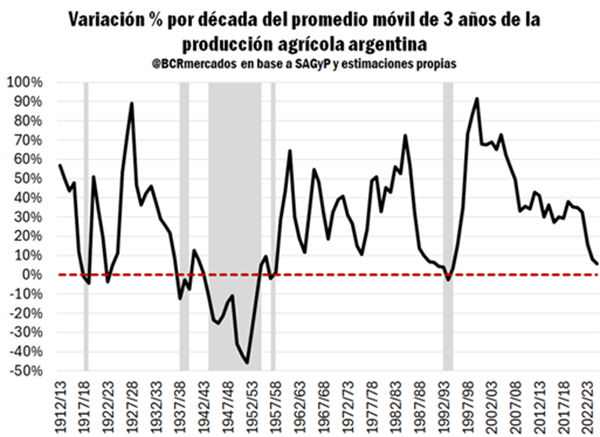 La producción agropecuaria argentina exhibe una trayectoria positiva de largo plazo, marcada por la expansión del área cultivada y la incorporación de innovaciones. Sin embargo, el análisis reciente muestra una desaceleración en la tasa de crecimiento.