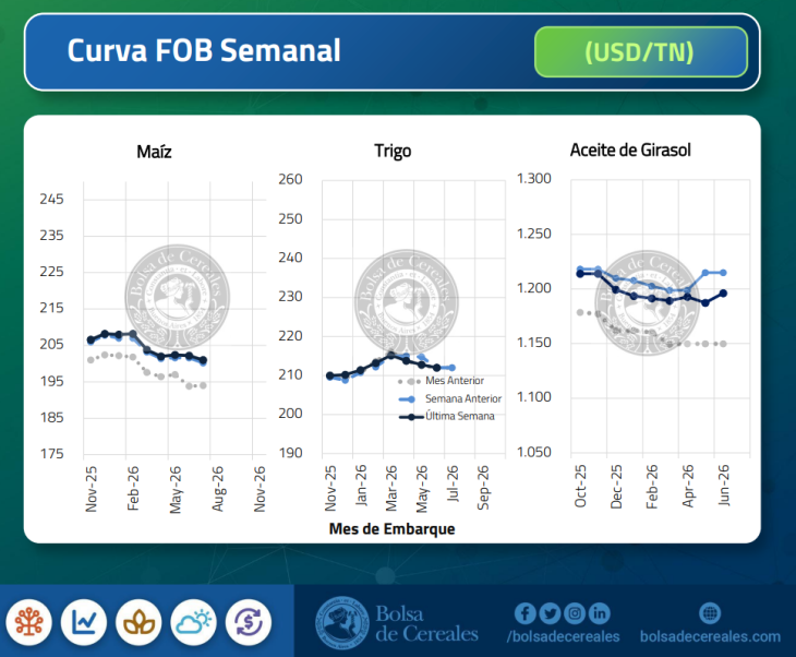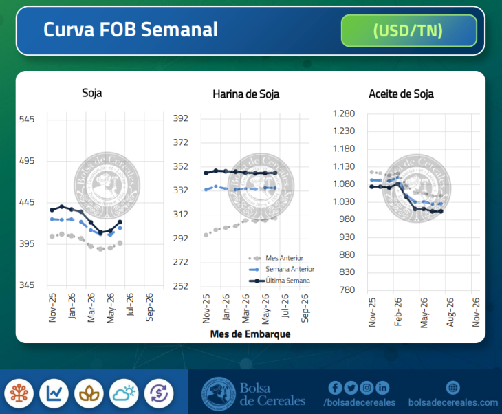 Para el embarque de noviembre de 2025, la Soja se cotizó en USD 439/TN y mantiene su valor en USD 440/TN para diciembre de 2025. Sin embargo, el análisis de la curva para la próxima cosecha muestra una fuerte corrección a la baja, llegando a su punto más bajo en mayo de 2026 con USD 408/TN, antes de recuperar terreno a USD 431/TN en agosto de 2026.