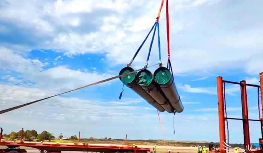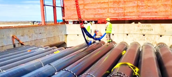 Los caños están destinados a los tramos terrestres y submarinos del gasoducto que conectará la red troncal de gas con el sistema marítimo en la zona de Fuerte Argentino, donde está previsto el montaje de las unidades flotantes. Esta infraestructura apunta a aprovechar el potencial productivo de Vaca Muerta y a generar nuevas cadenas de valor en el sector energético.