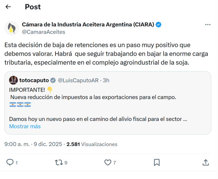 La Cámara de la Industria Aceitera Argentina y Centro de Exportadores de Cereales (CIARA-CEC) emitió una respuesta inmediata a la noticia. La entidad valoró el anuncio, señalando que "Esta decisión de baja de retenciones es un paso muy positivo que debemos valorar".