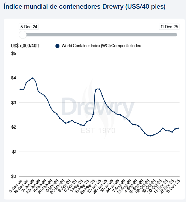 Los volúmenes de carga son escasos porque la mayoría del inventario de Navidad ya fue despachado en noviembre. La falta de volumen para embarcar está superando el efecto de la reducción de capacidad, lo que presiona a la baja las tarifas de flete.