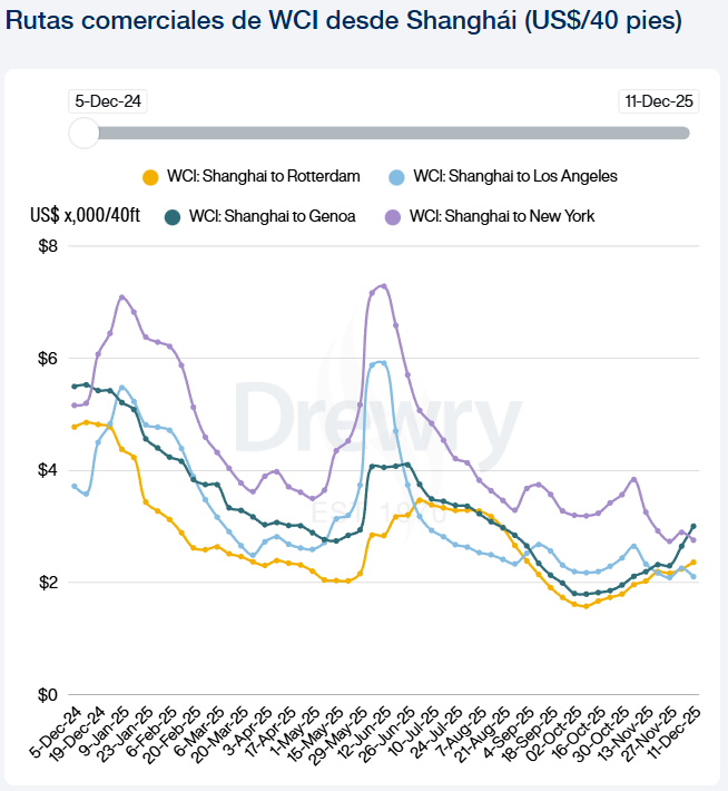 El ascenso del índice global está anclado en la demanda que se observa en los tráficos con destino a Europa. Las tarifas spot en la ruta Shanghái-Génova experimentaron un notable incremento del 13%, elevando su cotización a $3.004 por contenedor de 40 pies. Similarmente, la ruta Shanghái-Róterdam aumentó un 5% hasta los $2.361. Este fenómeno se explica por un cambio en los patrones estacionales: Drewry ha observado un crecimiento de la demanda de dos dígitos mes a mes en diciembre durante los últimos tres años, estableciendo fuertes volúmenes de cierre de año como la "nueva normalidad".