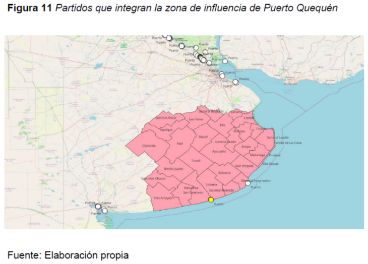 Partidos que integran la zona de influencia de Puerto Quequén. Ilustración: “APORTES PARA EL REORDENAMIENTO DEL TRANSPORTE DE GRANOS A PARTIR DE LA IMPLEMENTACIÓN DE TERMINALES INTERMODALES DENTRO DEL HINTERLAND DE PUERTO QUEQUÉN”