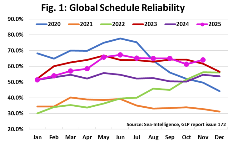 La confiabilidad naviera global subió al 64,1% en noviembre, marcando un crecimiento interanual del 9,5%.. Fuente: Sea-Intelligence