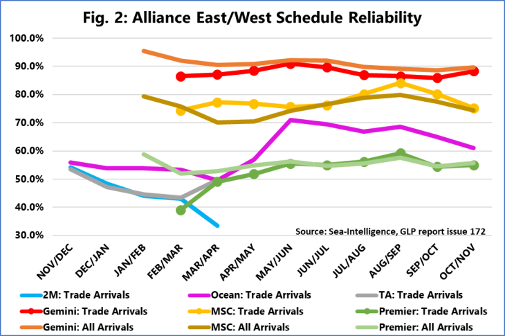 El informe también pone el foco en la performance de las grandes alianzas. Gemini Cooperation destacó con un 88,3% en arribos comerciales (Trade arrivals) y un 89,7% considerando la totalidad de sus escalas. Por su parte, MSC registró un 75,2% y Ocean Alliance un 61,1%, mientras que la Premier Alliance cerró con un 55,0%.