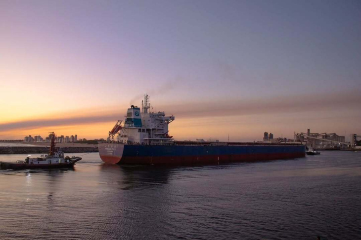El buque Shandong Fu Yi opera en Puerto Quequén para completar el primer embarque. Foto: Consorcio de Gestión de Puerto Quequén.