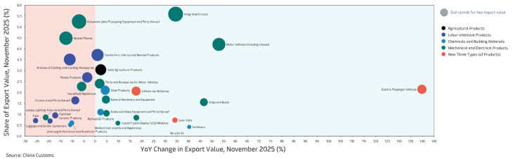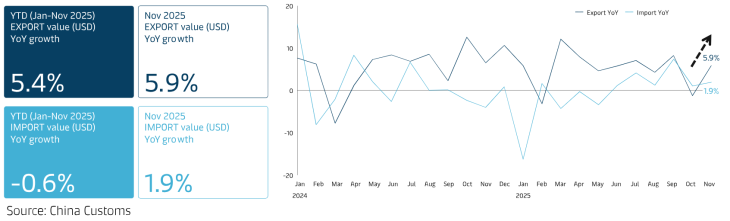 El informe señala que las exportaciones de China crecieron 5,9 % interanual en noviembre de 2025, con un avance acumulado de 5,4 % en los primeros once meses del año, según datos de Aduanas de China. Las importaciones aumentaron 1,9 % en noviembre, aunque aún registraron una baja acumulada de 0,6 % en el acumulado anual.