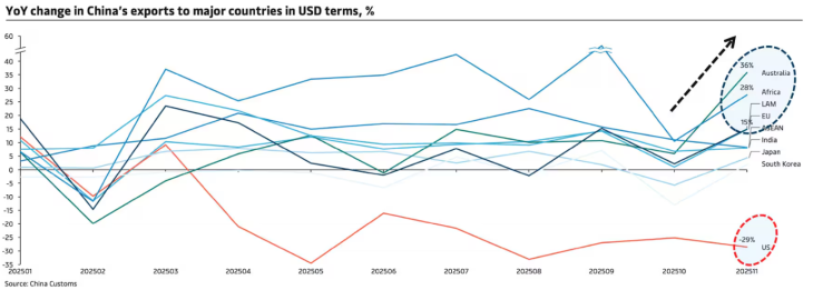 El reporte destaca una variación en los destinos de exportación del gigante asiático. Mientras los envíos a Estados Unidos cayeron un 29 % interanual, las exportaciones hacia la Unión Europea y mercados emergentes como América Latina, África y Australia mostraron incrementos relevantes. En paralelo, los bienes de alta tecnología ganaron participación, con una suba mayor al 140 % interanual en las exportaciones de vehículos eléctricos.