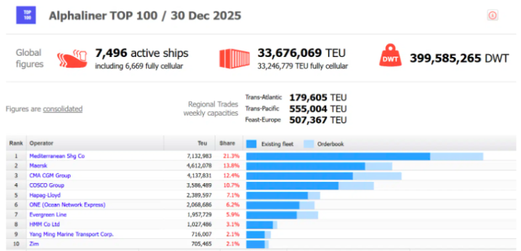 Ranking Alphaliner TOP 100 al 30 de diciembre de 2025, con datos sobre flota activa, capacidad total en TEU y toneladas de porte bruto (TPB), y participación de mercado de las principales navieras de contenedores a nivel global.