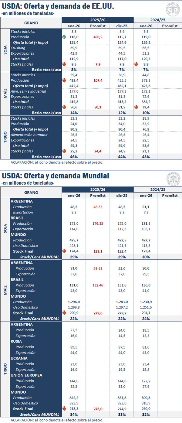 El primer reporte mensual del USDA de 2026, difundido recientemente y analizado por la Bolsa de Comercio de Rosario (BCR), sorprendió a los mercados por estimaciones que apuntan a una oferta más amplia de los principales granos, lo cual se tradujo en un impacto mayormente bajista sobre los precios internacionales.