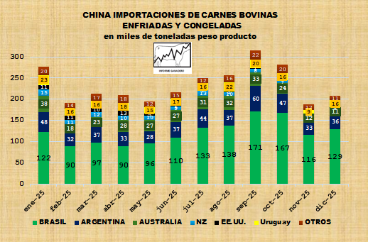 China importó 208 mil toneladas de carne bovina en diciembre. La incertidumbre por la definición de cuotas limitó el crecimiento, según datos del Informe Ganadero y GACC. Fuente: Informe Ganadero