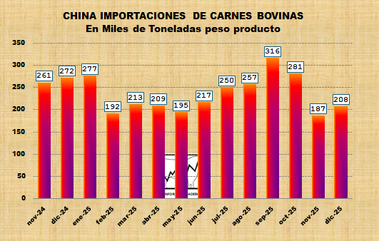 En diciembre, las importaciones chinas de carne bovina totalizaron 208 mil toneladas, mostrando una mejora respecto de noviembre, aunque el volumen se mantuvo en niveles bajos si se lo compara con los registros observados en meses anteriores.