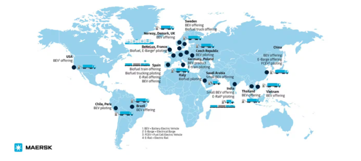En la mayoría de los 14 países, Maersk está cooperando con socios de transporte locales para desbloquear soluciones de transporte con vehículos eléctricos.
