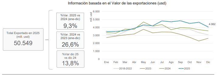 El sector agroindustrial argentino cerró el año 2025 con exportaciones por USD 50.549 millones, lo que representa un incremento interanual del 9,3%, de acuerdo con el informe elaborado por la Bolsa de Cereales de Buenos Aires y el Consejo Agroindustrial Argentino (CAA).