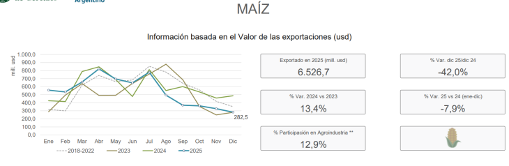En contraste, el maíz cerró el año con una caída interanual del 8%, afectado tanto por menores volúmenes como por condiciones de precios menos favorables.