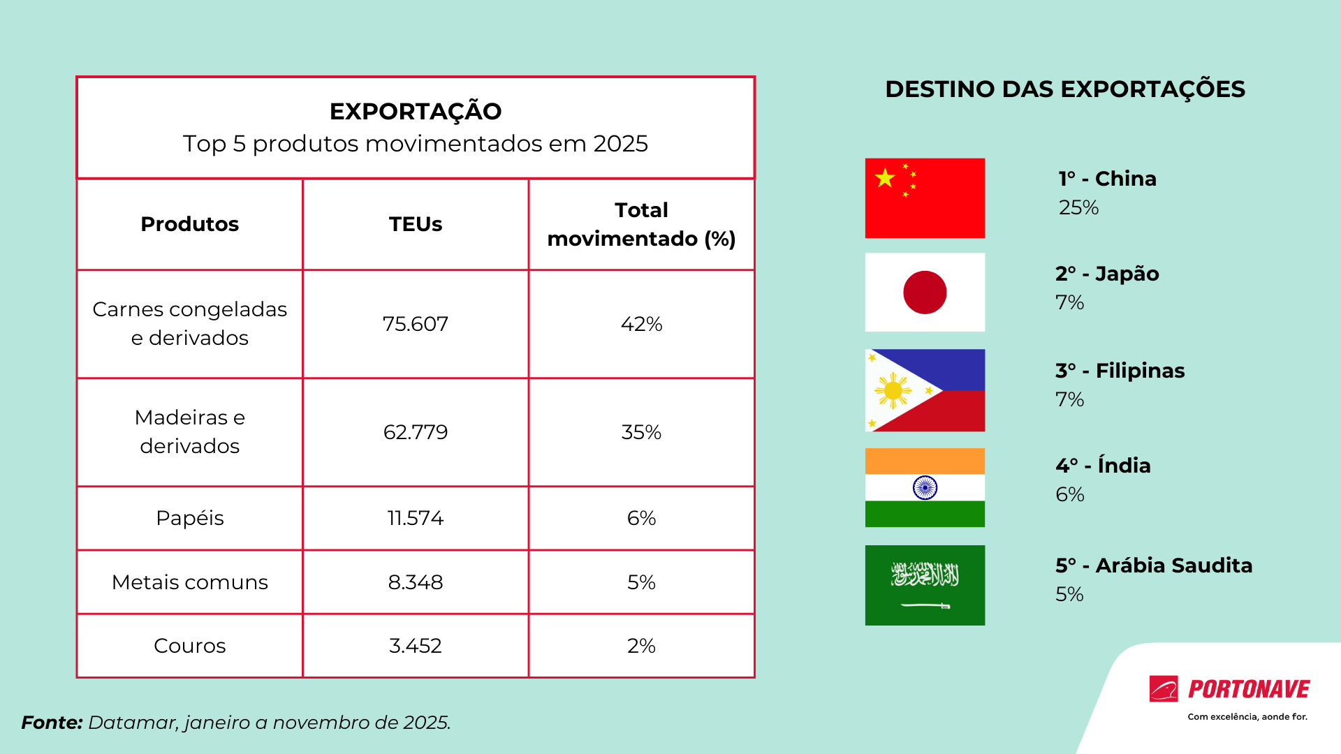 A lo largo de sus 18 años de funcionamiento, Portonave ha recibido 10.000 escalas de buques y ha gestionado 14.785.828 TEU. Para mantener su competitividad, está implementando un paquete de inversiones por un total de R$ 2.000 millones, que incluye la modernización del muelle y la adquisición de nuevos equipos. Con un muelle más robusto, de 17 metros de calado, se podrán recibir buques de hasta 400 metros de eslora, y se instalarán grúas modernas de mayor capacidad, previstas para el segundo semestre de este año. De esta forma, la capacidad de la Terminal Portuaria aumentará de 1,5 millones de TEU a 2 millones de TEU.