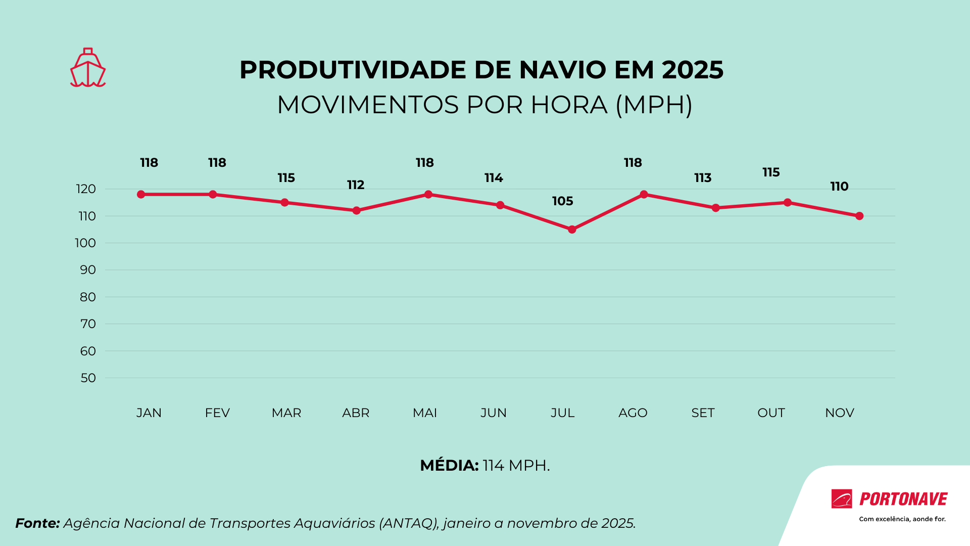 Portonave, la terminal portuaria privada pionera en Brasil, ha mantenido por segundo año consecutivo su liderazgo en productividad dentro del sector nacional. Durante el último año, la terminal logró movilizar un total de 1.108.029 TEU, alcanzando un promedio de 114 movimientos por hora (MPH), la marca más alta del país según los registros de la Agencia Nacional de Transportes Acuáticos (ANTAQ).