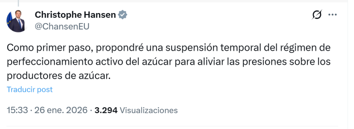 Propondré una suspensión temporal del régimen de perfeccionamiento activo del azúcar para aliviar la presión sobre los productores.