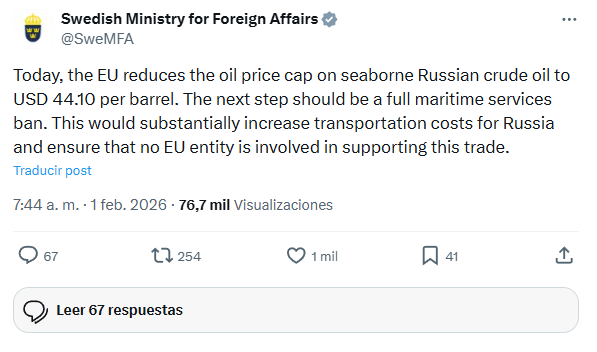 Desde la cartera sueca señalaron que la medida apunta a incrementar los costos logísticos del petróleo ruso y a limitar la participación de entidades europeas en este tipo de operaciones. En ese sentido, el organismo sostuvo que el próximo paso debería ser una prohibición total de los servicios marítimos asociados al transporte de crudo ruso.