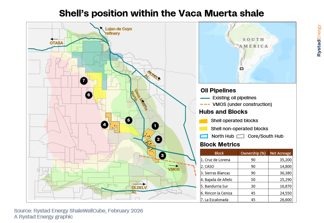 El estudio de Rystad Energy detalla que Shell opera intereses en siete bloques de Vaca Muerta, con cuatro de ellos bajo su gestión operativa —Cruz de Lorena, Coirón Amargo Sur Oeste (CASO), Bajada de Añelo y Sierras Blancas— y tres en posiciones no operadas, que abarcan cerca de 179.700 acres en zonas productivas del yacimiento.