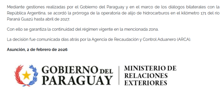 La operatoria de alijo de hidrocarburos en el kilómetro 171 del río Paraná Guazú fue extendida hasta abril de 2027, tras un acuerdo alcanzado entre los gobiernos de Paraguay y Argentina, de acuerdo con un comunicado oficial difundido por la Cancillería de la República del Paraguay el 2 de febrero de 2026.