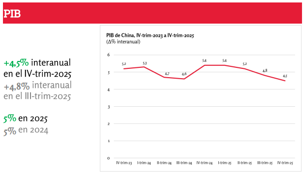 China inició 2026 con un crecimiento del 5% interanual en 2025, en línea con el objetivo oficial de “alrededor del 5%” y replicando el desempeño registrado en 2024, según el informe del Instituto de Estrategia Internacional (IEI) de la CERA.