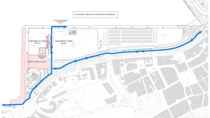 El nuevo itinerario peatonal provisional para alcanzar el Paseo Marítimo de Ribera discurre por detrás del Monte Kunfú y del edificio UCA SEA, no pudiéndose acceder al tramo norte del Llano mientras se ejecuta la obra.