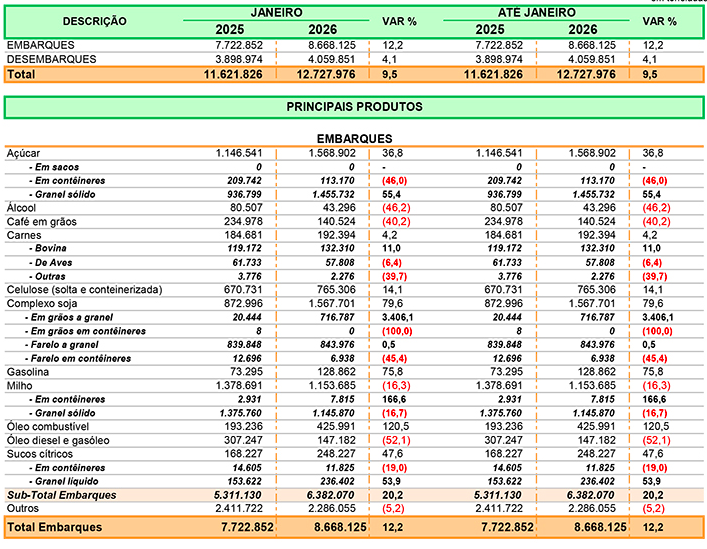 En el desagregado operativo, los embarques subieron a 8.668.125 toneladas (+12,2%), mientras los desembarques alcanzaron 4.059.851 toneladas (+4,1%). Esa combinación explica que el salto del mes se apoye más en la salida de cargas que en el ingreso, con el agro como motor del inicio de 2026.