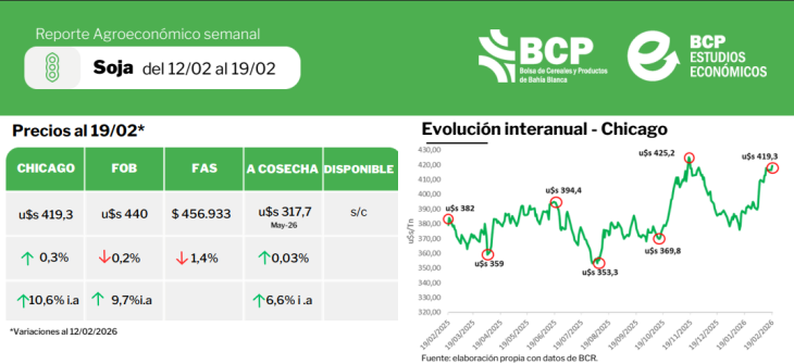 La soja cerró en Chicago a US$ 419,3 por tonelada (+0,3% semanal; +10,6% interanual), mientras que el FOB se ubicó en US$ 440 y el FAS en $456.933.