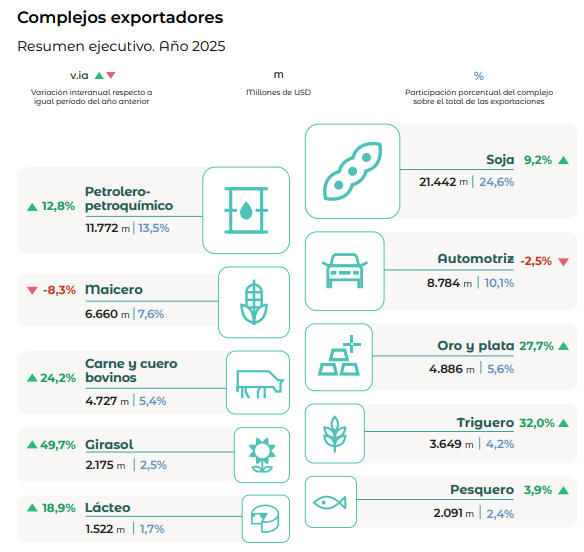 La soja volvió a posicionarse como el principal complejo exportador de Argentina en 2025, concentrando US$21.442 millones en ventas externas y representando el 24,6% del total exportado por el país, de acuerdo con el informe sobre complejos exportadores publicado por el INDEC.