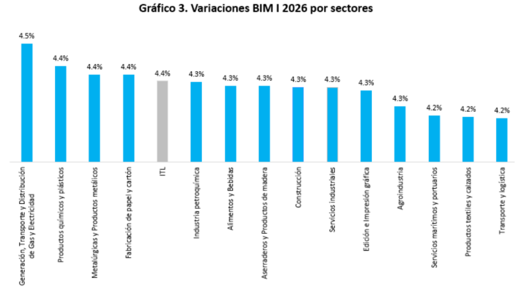 El análisis sectorial indica además que las variaciones entre actividades industriales resultaron relativamente homogéneas, con aumentos que oscilaron entre 4,2% y 4,5%. El sector con mayor impacto fue generación, transporte y distribución de gas y electricidad, con un aumento del 4,5%, mientras que transporte y logística presentó el menor incremento, con 4,2%.
