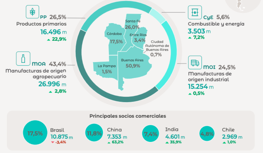 La Región Pampeana, que en 2025 concentró 53,6% de las exportaciones argentinas, presenta una fuerte inserción en los mercados asiáticos y regionales impulsada por el complejo cerealero-oleaginoso y agroindustrial.