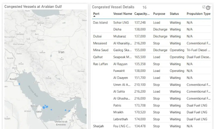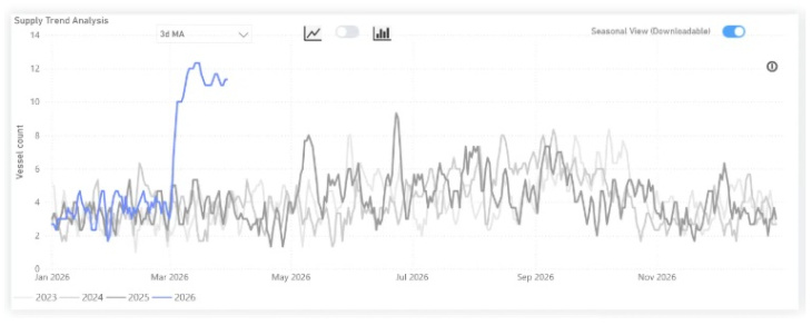 Uno de los indicadores más claros de esta disrupción se observa en el comportamiento de la flota en el Golfo. El análisis evidencia una ruptura respecto a los patrones habituales de tránsito en el Estrecho de Ormuz, donde el promedio móvil de tres días alcanzó aproximadamente 11 buques LNG en marzo, frente a un nivel típico de entre 3 y 4 unidades.