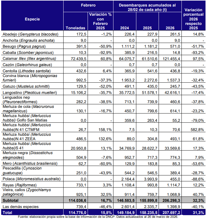 El sector pesquero argentino cerró el primer bimestre de 2026 con señales mixtas, pero con un balance de volumen claramente positivo. Según el último Informe de Coyuntura de la Secretaría de Agricultura, Ganadería y Pesca , los desembarques totales alcanzaron las 207.697 toneladas al 28 de febrero, lo que representa un salto del 31,3% respecto al mismo período del año anterior.