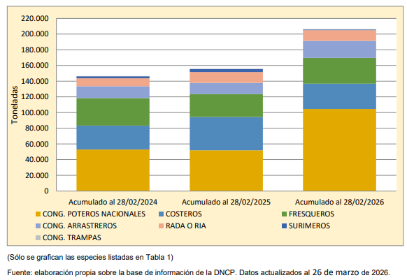 En el plano del comercio exterior, la balanza comercial pesquera arrojó un superávit de 343 millones de dólares en el acumulado anual, un 24,4% más que el año pasado. Durante febrero, las ventas al exterior sumaron 213,1 millones de dólares, manteniéndose en niveles similares a los de 2025 pese a una ligera baja en el tonelaje exportado.
