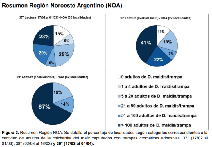 En el NOA, el 100% de las localidades relevadas presentó presencia del insecto. Las capturas promedio pasaron de 128,3 a 315,6 adultos por trampa. En las localidades de Las Termas (Santiago del Estero) y El Bananal (Jujuy) se registraron valores superiores a 1.400 individuos por trampa.