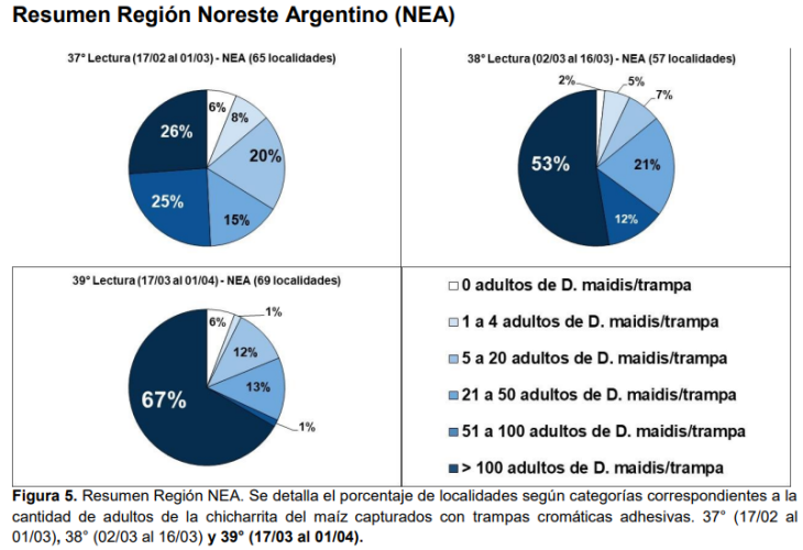En el NEA, el 94% de las localidades registró presencia. Las capturas promedio alcanzaron los 322,9 adultos por trampa en lotes de maíz.