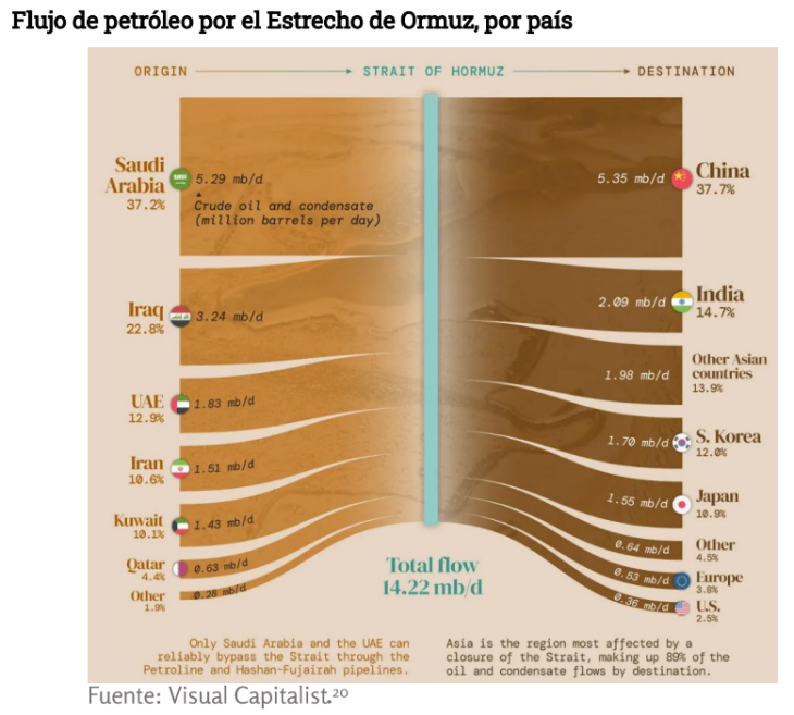 Según el informe del Instituto de Estrategia Internacional (CERA), el recrudecimiento del conflicto —tras los ataques de Estados Unidos e Israel contra Irán— generó disrupciones logísticas en el Estrecho de Ormuz, un punto crítico por donde transita cerca del 20% del petróleo global y el 25% del gas natural licuado.
