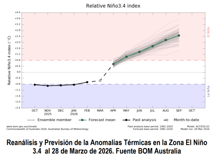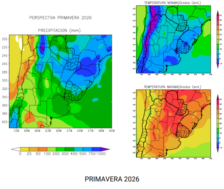 De consolidarse la tendencia, la primavera de 2026 presentaría un patrón típico de “El Niño”, con lluvias por encima de lo normal en gran parte del área agrícola del sur del continente y una reducción de la franja seca que se observa actualmente en el interior del país.