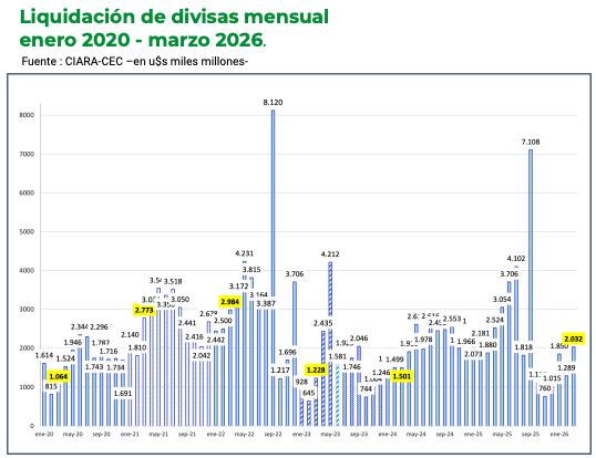 El complejo agroindustrial argentino liquidó en marzo US$ 2.032 millones, lo que representó un aumento del 57% respecto de febrero. En el acumulado del primer trimestre, el ingreso total fue de US$ 5.172 millones, un 15% inferior al mismo período de 2025.