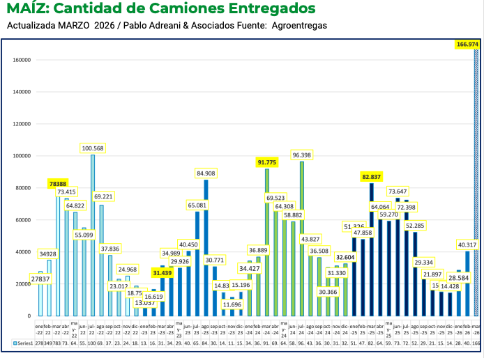 El ingreso de camiones de maíz a los puertos alcanzó 166.974 unidades en marzo, frente a 40.317 en febrero. Este volumen equivale a 5,34 millones de toneladas, con aproximadamente el 15% de la cosecha recolectada hacia fines de mes