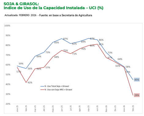 El uso de la capacidad instalada de la industria aceitera fue del 45%. Sin importaciones de soja —que alcanzaron 831 mil toneladas— la utilización se habría ubicado en 29%.