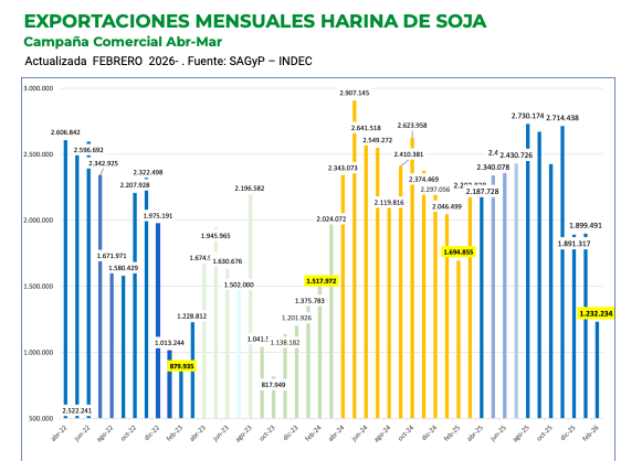 En el complejo soja, las exportaciones de harina alcanzaron 1,23 millones de toneladas, mientras que las de aceite se ubicaron en 235 mil toneladas, con una caída del 44% mensual.
