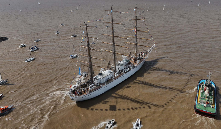 Tras entonarse el Himno Nacional Argentino y darse lectura a la orden de zarpada, el canciller Quirno Magrane pronunció palabras alusivas en las que destacó el carácter simbólico del viaje y la responsabilidad de la tripulación al representar al país en el exterior: "La Argentina vuelve a depositar en ustedes su prestigio, su historia y su bandera. Cuando se suelten las amarras, cada uno de ustedes será la Patria en el mar y tendrá la enorme responsabilidad de honrarla con disciplina, coraje y espíritu de servicio".