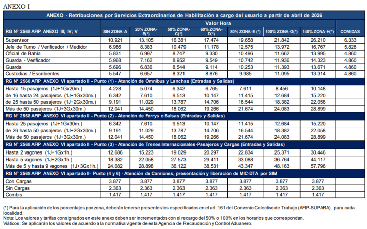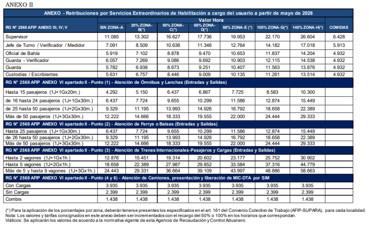 La Agencia de Recaudación y Control Aduanero (ARCA) publicó el 20 de abril de 2026 en el Boletín Oficial la Resolución General 5834/2026, mediante la cual aprobó los nuevos cuadros tarifarios para las prestaciones que en carácter de servicios extraordinarios realice el personal del organismo.